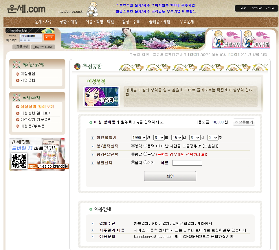 신년 운세를 보실 수 있으며 그 외 여러가지 애정운, 인생운, 사업운등 많은 운세보기가 준비되어 있습니다.