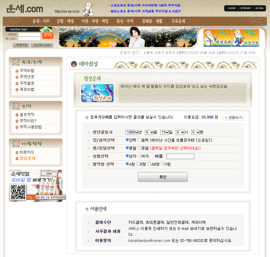 오늘의무료운세 인터넷사주 사주운세닷컴 윷점 운세닷컴입니다. 무료사주운세 궁금하시나요? 궁금한 나의 운운!! 지금 무료로 확인해보세요! 운세닷컴 +각종 다양한 운세 더 보기 ▶토정비결 전문 사이트 바로가기 ▶사주 전화 상담 하기 이름풀이 남여궁합 무료운세사주 사주운세닷컴 인터넷사주 오늘의무료운세 작명 운세닷컴 개명 무료이름풀이 운세닷컴 이름풀이 남여궁합 태그 성명학 무료궁합 궁합 운세닷컴 이름풀이
